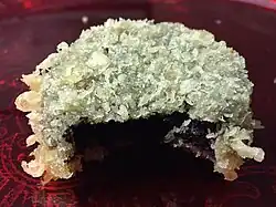 Cooked pieces of tempura are either eaten with dipping sauce, salted without sauce, or used to assemble other dishes. Tempura is commonly served with grated daikon and eaten hot immediately after frying. In Japan, it is often found in bowls of soba or udon soup in the form of shrimp, shiso leaf, or fritter. The most common sauce is tentsuyu sauce (roughly three parts dashi, one part mirin, and one part shōyu). Alternatively, skim tempura may be sprinkled with sea salt before eating. Mixtures of powdered green tea and salt or yuzu and salt are also used.[17] Kakiage is a type of tempura made with mixed vegetable strips, such as onion, carrot, and burdock, and sometimes including shrimp or squid, which are deep fried as small round fritters.