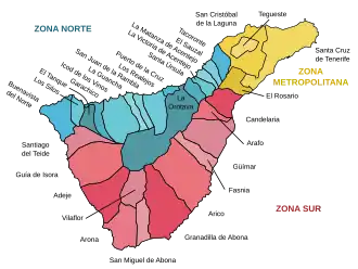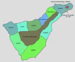 Two independent achimenceyatos were created on the island, and the island was divided into nine menceyatos. The menceyes within them formed what were similar to municipalities today.[28] The menceyatos and their menceyes (ordered by the names of descendants of Tinerfe who ruled them) were the following: