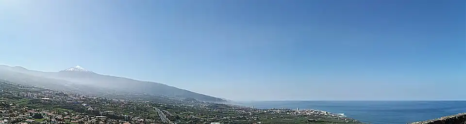 Major climatic contrasts on the island are evident, especially during the winter months when it is possible to enjoy the warm sunshine on the coast and experience snow within 3,000 metres (10,000 feet) above sea level on Teide.[54] There are also major contrasts at low altitude, where the climate ranges from arid (Köppen BWh) on the southeastern side represented by Santa Cruz de Tenerife to Mediterranean (Csa/Csb) on the northwestern side in Buenavista del Norte and La Orotava.[55]