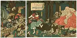 Tengu are often pictured as taking the shape of some sort of priest. Beginning in the 13th century, tengu came to be associated in particular with yamabushi, the mountain ascetics who practice Shugendō.[7] The association soon found its way into Japanese art, where tengu are most frequently depicted in the yamabushi's unique costume, which includes a distinctive headwear called the tokin and a pompom sash (結袈裟, yuigesa).[8] Due to their priestly aesthetic, they are often shown wielding the khakkhara, a distinct staff used by Buddhist monks, called a shakujō in Japanese.