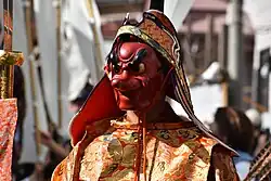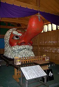 The tengu in art appears in a variety of shapes. It usually falls somewhere in between a large, monstrous bird and a wholly anthropomorphized being, often with a red face or an unusually large or long nose. Early depictions of tengu show them as kite-like beings who can take a human-like form, often retaining avian wings, heads, or beaks. The tengu's long nose seems to have been conceived in the 14th century, likely as a humanization of the original bird's bill.[3] This feature allies them with the Sarutahiko Ōkami, who is described in the 720 CE text the Nihon Shoki with a similar nose measuring seven hand-spans in length.[4] In village festivals, the two figures are often portrayed with identical red phallic-nosed mask designs.[5]