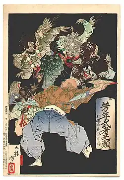 During the 14th century, the tengu began to trouble the world outside of the Buddhist clergy, and like their ominous ancestors the tiāngǒu, the tengu became creatures associated with war.[38] Legends eventually ascribed to them great knowledge in the art of skilled combat.