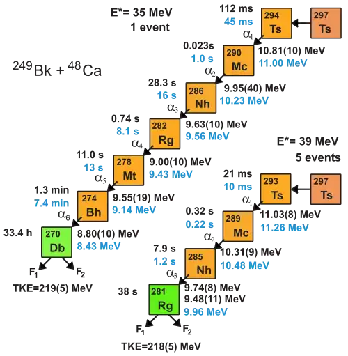 - ^ Zlokazov, V.B.; Utyonkov, V.K. (8 June 2017). "Analysis of decay chains of superheavy nuclei produced in the 249Bk + 48Ca and 243Am + 48Ca reactions". Journal of Physics G: Nuclear and Particle Physics. 44 (7): 075107. Bibcode:2017JPhG...44g5107Z. doi:10.1088/1361-6471/aa7293.