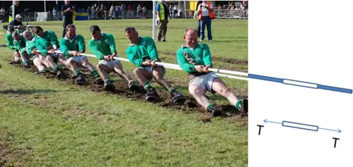 One segment is duplicated in a free body diagram showing a pair of action-reaction forces of magnitude T pulling the segment in opposite directions, where T is transmitted axially and is called the tension force. This end of the rope is pulling the tug of war team to the right.