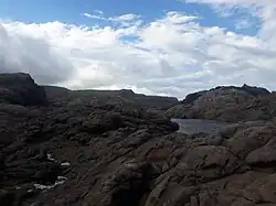 - Guilherme Moniz Volcanic Complex: the southern portion, in the central part of the island, began erupting about 100,000 years later (about 270,000 ka) and produced trachyte domes (approximately 808 m/2651 ft in altitude), flows, and minor pyroclastic deposits for another 100,000 years (until at least 111 ka). The highest point along the caldera rim reaches 623 metres (2,044 feet). The northern portion of the Caldera is less well exposed, but reflects a similar age range. The northwest portion of the caldera was formed sometime after 44 ka. Several well-studied ignimbrites that blanket much of the island likely erupted from Guilherme Moniz Volcano.