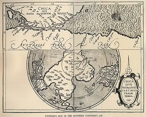 The Flemish geographer and cartographer, Cornelius Wytfliet, wrote concerning the Terra Australis in his 1597 book, Descriptionis Ptolemaicae Augmentum: