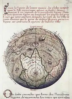 The first depiction of Terra Australis on a globe was probably on Johannes Schöner's lost 1523 globe on which Oronce Fine is thought to have based his 1531 double cordiform (heart-shaped) map of the world.[12][13] On this landmass he wrote "recently discovered but not yet completely explored".[14] The body of water beyond the tip of South America is called the "Mare Magellanicum", one of the first uses of navigator Ferdinand Magellan's name in such a context.[15]