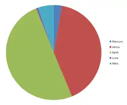The uncompressed densities of the rounded terrestrial bodies directly orbiting the Sun trend towards lower values as the distance from the Sun increases, consistent with the temperature gradient that would have existed within the primordial solar nebula. The Galilean satellites show a similar trend going outwards from Jupiter; however, no such trend is observable for the icy satellites of Saturn or Uranus.[12] The icy worlds typically have densities less than 2 g·cm−3. Eris is significantly denser (2.43±0.05 g·cm−3), and may be mostly rocky with some surface ice, like Europa.[2] It is unknown whether extrasolar terrestrial planets in general will follow such a trend.
