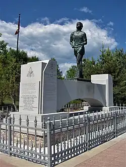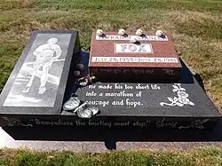 His funeral in Port Coquitlam was attended by 40 relatives and 200 guests,[72] and broadcast on national television. Hundreds of communities across Canada also held memorial services,[73] a public memorial service was held on Parliament Hill in Ottawa,[74] and Canadians again overwhelmed Cancer Society offices with donations.[75] Fox is buried at Port Coquitlam Municipal Cemetery.[76]