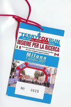 Over 300,000 people took part and raised $3.5 million in the first Terry Fox Run.[97] Schools across Canada were urged to join the second run, held on September 19, 1982.[98] School participation has continued since, evolving into the National School Run Day.[99] The runs, which raised over $20 million in their first six years,[96] grew into an international event as over one million people in 60 countries took part in 1999, raising $15 million that year alone.[100] By the Terry Fox Run's 25th anniversary, more than three million people were taking part annually. Grants from the Terry Fox Foundation, which organizes the runs, have helped Canadian scientists make numerous advances in cancer research.[101] The Terry Fox Run is the world's largest one-day fundraiser for cancer research,[102] and over $850 million has been raised in his name as of May 2022.[103]