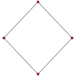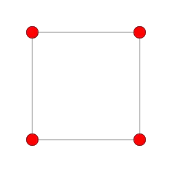 The regular complex polytope 4{4}2, , in has a real representation as a tesseract or 4-4 duoprism in 4-dimensional space. 4{4}2 has 16 vertices, and 8 4-edges. Its symmetry is 4[4]2, order 32. It also has a lower symmetry construction, , or 4{}×4{}, with symmetry 4[2]4, order 16. This is the symmetry if the red and blue 4-edges are considered distinct.[16]