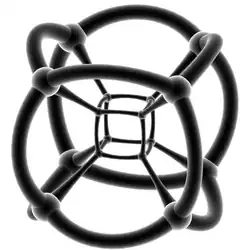 The eight cells of a tesseract may be regarded in three different ways as two interlocked rings of four cubes.[10] As a regular polytope with three cubes folded together around every edge, it has Schläfli symbol {4,3,3} with hyperoctahedral symmetry of order 384. Constructed as a 4D hyperprism made of two parallel cubes, it can be named as a composite Schläfli symbol {4,3} × { }, with symmetry order 96. As a 4-4 duoprism, a Cartesian product of two squares, it can be named by a composite Schläfli symbol {4}×{4}, with symmetry order 64. As an orthotope it can be represented by composite Schläfli symbol { } × { } × { } × { } or { }4, with symmetry order 16.