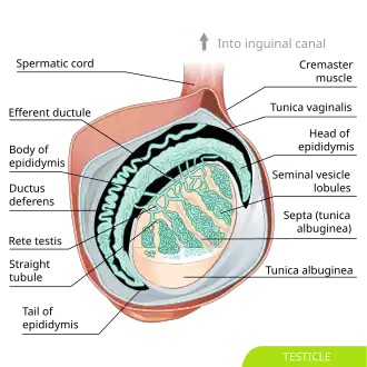 The testes are covered by a tough fibrous shell called the tunica albuginea.[5] Under the tunica albuginea, the testes contain very fine-coiled tubes called seminiferous tubules.[5] The tubules are lined with a layer of cells (germ cells) that develop from puberty through old age into sperm cells (also known as spermatozoa or male gametes).[5] The developing sperm travel through the seminiferous tubules to the rete testis located in the mediastinum testis, to the efferent ducts, and then to the epididymis where newly created sperm cells mature (spermatogenesis).[6] The sperm move into the vas deferens, and are eventually expelled through the urethra and out of the urethral orifice through muscular contractions.[6]