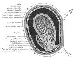 Many anatomical features of the adult testis reflect its developmental origin in the abdomen. The layers of tissue enclosing each testicle are derived from the layers of the anterior abdominal wall.[1] The cremasteric muscle arises from the internal oblique muscle.[1][19]