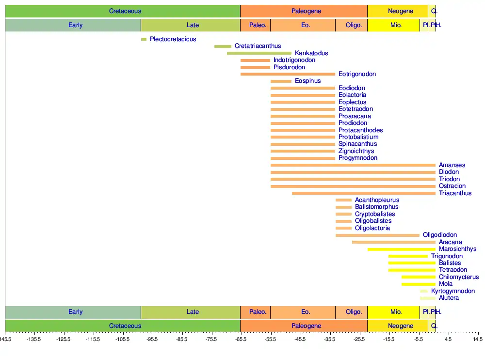 Traditionally, the oldest recognized tetraodontiforms are the extinct suborder Plectocretacicoidei from the Late Cretaceous (Santonian to Campanian) of Italy and Slovenia, both in the former Tethyan region. These comprise the families Cretatriacanthidae and Protriacanthidae. Plectocretacicus from the Cenomanian of Lebanon has also been proposed as a tetraodontiform, but this has been more recently questioned.[8] More recent studies have also questioned the placement of the Plectrocretacicoidei in the Tetraodontiformes, due to their ancient nature contrasting with the position of the Tetraodontiformes as the most derived percomorph lineage, and the group displaying many traits that are not present in modern tetraodontiforms or are not exclusively found in them. It has thus been suggested that the Plectocretacicoidei might either represent indeterminate percomorphs or basal members of a more inclusive Acanthuriformes. If the Plectocretacicoidei are excluded, the earliest definitive fossil tetraodontiforms are a number of genera known from the earliest Eocene.[1]