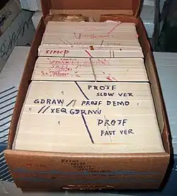 Before text editors existed, computer text was punched into cards with keypunch machines.[5] Physical boxes of these thin cardboard cards were then inserted into a card reader. Magnetic tape, drum and disk card image files created from such card decks often had no line-separation characters at all, and assumed fixed-length[a] 80- or 90-character[6] records.[7] An alternative to cards was Punched tape. It could be created by some teleprinters (such as the Teletype), which used special characters to indicate ends of records.[8] Some early operating systems included batch text editors, either integrated with language processors or as separate utility programs; one early example was the ability to edit SQUOZE source files for SCAT[9] in the SHARE Operating System.