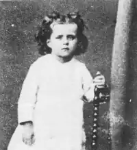 On 2 April 1874, when she was 15 months old, she returned to Alençon where her family surrounded her with affection. "I hear the baby calling me Mama! as she goes down the stairs. On every step, she calls out Mama! and if I don't respond every time, she remains there without going either forward or back." (Madame Martin to Pauline, 21 November 1875) She was educated in a very Catholic environment, including Mass attendance at 5:30 a.m., the strict observance of fasts, and prayer to the rhythm of the liturgical year. The Martins also practiced charity, visiting the sick and elderly and welcoming the occasional vagabond to their table. Even if she was not the model little girl her sisters later portrayed, Therese was very responsive to this education. She played at being a nun. Described as generally a happy child, she also manifested other emotions, and often cried: "Céline is playing with the little one with some bricks […] I have to correct poor baby who gets into frightful tantrums when she can't have her own way.[18] She rolls in the floor in despair believing all is lost. Sometimes she is so overcome she almost chokes. She's a nervous child, but she is very good, very intelligent, and remembers everything."[17] At 22, Therese, then a Carmelite, admitted: "I was far from being a perfect little girl".[19]