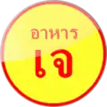 Traditional Thai vegetarian restaurants will carry yellow signs with che (Thai: เจ) (left) or ahan che (Thai: อาหารเจ) (right) written in red in Thai script.