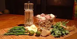 Thai meals typically consist of rice (khao in Thai) with many complementary dishes shared by all. The dishes are all served at the same time, including the soups, and it is also customary to provide more dishes than there are guests at a table. A Thai family meal would normally consist of rice with several dishes which should form a harmonious contrast of flavors and textures as well as preparation methods. Traditionally, a meal would have at least five elements: a dip or relish for raw or cooked vegetables (khrueang chim) is the most crucial component of any Thai meal.[24][25]Khrueang chim, considered a building block of Thai food by Chef McDang, may come in the form of a spicy chili sauce or relish called nam phrik (made of raw or cooked chilies and other ingredients, which are then mashed together), or a type of dip enriched with coconut milk called lon. The other elements would include a clear soup (perhaps a spicy tom yam or a mellow tom chuet), a curry or stew (essentially any dish identified with the kaeng prefix), a deep-fried dish, and a stir-fried dish of meat, fish, seafood, or vegetables.