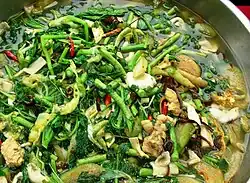 Among the green, leafy vegetables and herbs that are usually eaten raw in a meal or as a side dish in Thailand, the most important are: phak bung (morning glory), horapha (Thai basil), bai bua bok (Asian pennywort), phak kachet (water mimosa), phak kat khao (Chinese cabbage), phak phai (praew leaves), phak kayang (rice paddy herb), phak chi farang (culantro), phak tiu (Cratoxylum formosum), phak "phaai" (yellow burr head) and kalamplī (cabbage).[38] Some of these leaves are highly perishable and must be used within a couple of days.