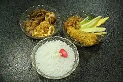 When time is limited or when eating alone, single dishes, such as fried rice or noodle soups, are quick and filling. An alternative is to have one or more smaller helpings of curry, stir fries and other dishes served together on one plate with a portion of rice. This style of serving food is called khao rat kaeng (lit.'rice covered with curry'), or for short khao kaeng (lit.'rice curry'). Eateries and shops that specialize in pre-made food are the usual place to go to for having a meal this way. These venues have a large display showing the different dishes one can choose. When placing an order at these places, Thais will state if they want the food served as separate dishes or together on one plate with rice (rat khao). Very often, regular restaurants will also feature a selection of freshly made "rice curry" dishes on their menu for single customers.