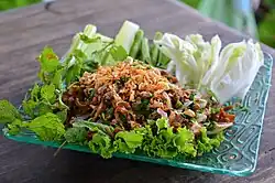 ^Holger Y. Toschka; Valeeratana K. Sinsawasdi; Nithiya Rattanapanone, eds. (2022). "Thai Cuisine Identity". The Science of Thai Cuisine: Chemical Properties and Sensory Attributes. CRC Press. p. 7. ISBN 978-1-032-02328-1. Apart from that, it is the Isan or northeastern Thai cuisine that reflects the essence of the arid Khorat Plaetau and its food sources. These are similar to the culture of Laos, enriched by the Khmer cuisine.