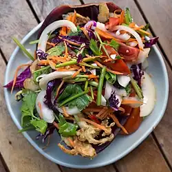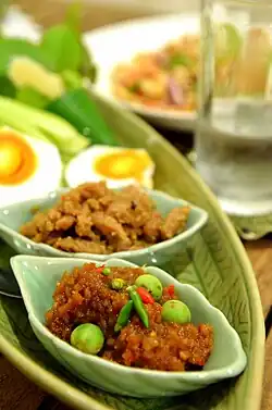 Fruit is not only eaten on its own, but often served with spicy dips made from sugar, salt, and chilies.[42] Fruits feature in spicy salads such as som tam (green papaya salad) and yam som-o (pomelo salad), in soups with tamarind juice such as tom khlong and kaeng som, and in Thai curries such as kaeng khanun (jackfruit curry), kaeng phet pet yang (grilled duck curry with pineapple or grapes), and kaeng pla sapparot (fish and pineapple curry). Fruits are also used in certain Thai chili pastes, such as in nam phrik long rue made with madan (a close relative of the mangosteen),[43] and nam phrik luk namliap, salted black Chinese olive chilli paste.[44]