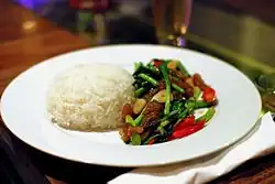 There is scarcely a Thai dish that is not sold by a street vendor or at a market somewhere in Thailand. Some specialize in only one or two dishes; others offer a complete menu that rival that of restaurants. Some sell only pre-cooked foods, while others make food to order. Foods that are made to order tend to be dishes that can be quickly prepared: quick stir fries with rice, such as phat kaphrao (spicy basil-fried minced pork, chicken, or seafood)[86] or phat khana (stir fried gailan) and quick curries such as pladuk phat phet (catfish fried with red curry paste).