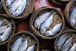An ingredient found in many Thai dishes and used in every region of the country is nam pla, a clear fish sauce that is very aromatic. Fish sauce is a staple ingredient in Thai cuisine and imparts a unique character to Thai food. Fish sauce is prepared with fermented fish that is made into a fragrant condiment and provides a salty flavor. There are many varieties of fish sauce and many variations in the way it is prepared. Some fish may be fermented with shrimp or spices. Another type of sauce made from fermented fish is pla ra. It is more pungent than nam pla, and, in contrast to nam pla, which is a clear liquid, pla ra is opaque and often contains pieces of fish. To add this sauce to a som tam (spicy papaya salad) is a matter of choice. Kapi, Thai shrimp paste, is a combination of fermented ground shrimp and salt. It is used in the famous chili paste called nam phrik kapi, in rice dishes such as khao khluk kapi and it is indispensable for making Thai curry pastes. Tai pla is a pungent sauce used in the southern Thai cuisine, that is made from the fermented innards of the short mackerel (pla thu).[33] It is one of the main condiments of kaeng tai pla curry and is also used to make nam phrik tai pla.[34] Far removed from the nearest sea, from northern Thailand comes nam pu, a thick, black paste made by boiling mashed rice-paddy crabs for hours. It is used as an ingredient for certain northern Thai salads, curries, and chili pastes. It too has a strong and pungent flavor.[35]