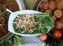 From the coconut comes coconut milk, used both in curries and desserts, and coconut oil.[49] The juice of a green coconut can be served as a drink and the young flesh is eaten in either sweet or savory dishes. The grated flesh of a mature coconut is used raw or toasted in sweets, salads and snacks such as miang kham.[50] Thais not only consume products derived from the nut (actually a drupe), but they also make use of the growth bud of the palm tree as a vegetable. From the stalk of the flowers comes a sap that can be used to make coconut vinegar, alcoholic beverages, and sugar. Coconut milk and other coconut-derived ingredients feature heavily in the cuisines of central and southern Thailand. In contrast to these regions, coconut palms do not grow as well in northern and northeastern Thailand, where in wintertime the temperatures are lower and where there is a dry season that can last five to six months. In northern Thai cuisine, only a few dishes, most notably the noodle soup khao soi, use coconut milk. In the southern parts of northeastern Thailand, where the region borders Cambodia, one can again find dishes containing coconut. It is also here that the people eat non-glutinous rice, just as in central and southern Thailand, and not glutinous rice as they do in northern Thailand and in the rest of northeastern Thailand.[51]