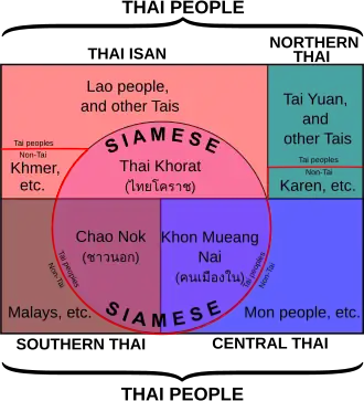 Thai people, historically known as Siamese people, are an ethnic group native to Thailand. In a narrower and ethnic sense, the Thais are also a Tai ethnic group dominant in Central Thailand (Siam proper).[25][26][27][28][29][2][30] Part of the larger Tai ethno-linguistic group native to Southeast Asia as well as Southern China, Thais speak the Sukhothai languages (Central Thai and Southern Thai language),[31] which is classified as part of the Kra–Dai family of languages. The majority of Thais are followers of Theravada Buddhism.