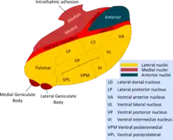 The principal subdivision of the thalamus into nucleus groups is the trisection of each thalamus (left and right) by a Y-shaped internal medullary lamina. This trisection divides each thalamus into anterior, medial and lateral groups of nuclei.[9] The medial group is subdivided into the medial dorsal nucleus and midline group. The lateral group is subdivided into ventral, pulvinar, lateral dorsal, lateral posterior and metathalamus. The ventral group is further subdivided into ventral anterior, ventral lateral and ventral posterior.