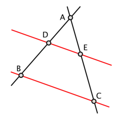 Proclus attributes to Thales the discovery that a circle is bisected by its diameter, that the base angles of an isosceles triangle are equal and that vertical angles are equal.[57] Two fundamental theorems of elementary geometry are customarily called Thales's theorem: one of them has to do with a triangle inscribed in a circle and having the circle's diameter as one side;[57] the other, also called the intercept theorem, is about an angle intercepted by two parallel lines, forming a pair of similar triangles.