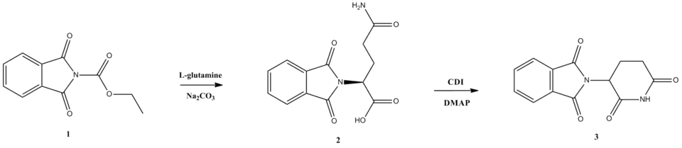 Celgene Corporation originally synthesized thalidomide using a three-step sequence starting with L-glutamic acid treatment, but this has since been reformed by the use of L-glutamine.[38] As shown in the image below, N-carbethoxyphthalimide (1) can react with L-glutamine to yield N-phthaloyl-L-glutamine (2). Cyclization of N-phthaloyl-L-glutamine occurs using carbonyldiimidazole, which then yields thalidomide (3).[38] Celgene Corporation's original method resulted in a 31% yield of S-thalidomide, whereas the two-step synthesis yields 85–93% product that is 99% pure.