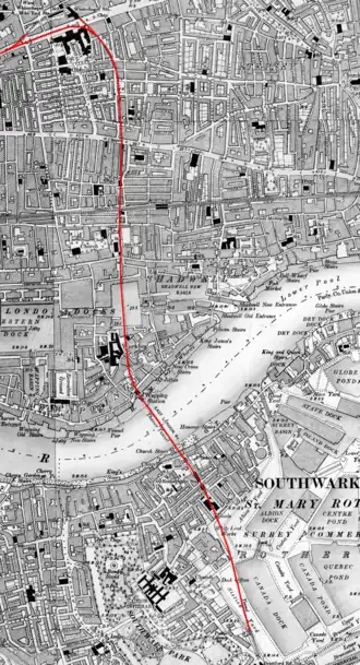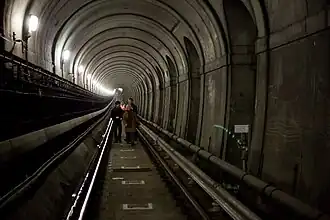 The first train ran through the tunnel on 7 December 1869.[4] In 1884, the tunnel's disused construction shaft to the north of the river was repurposed to serve as Wapping station.