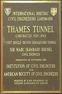 In 1991, the Thames Tunnel was designated as an International Historic Civil Engineering Landmark by the American Society of Civil Engineers and the Institution of Civil Engineers.[18]