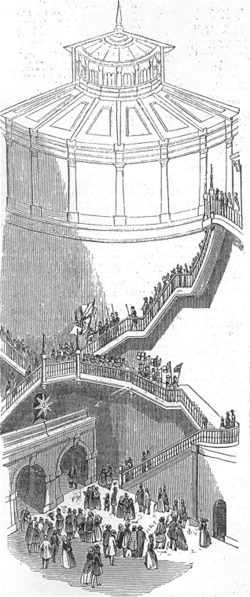 Amongst the blocks of buildings [in Wapping] that separate the street from the river, we notice an octagonal edifice of marble. We enter by one of several great doors, and find ourselves in a rotunda of fifty feet diameter, and the floor laid in mosaic work of blue and white marble. The walls are stuccoed, around which are stands for the sale of papers, pamphlets, books, confectioners, beer, &c. A sort of watch-house stands on the side of the rotunda next the river, in which is a fat publican, or tax gatherer. Before him is a brass turnstile, through which you are permitted to pass, on paying him a penny, and, entering a door, you begin to descend the shaft, by a flight of very long marble steps that descend to a wide platform, from which the next series of steps descends in an opposite direction. The walls of the shaft are circular, finished in stucco, and hung with paintings and other curious objects. You halt a few moments on the first platform and listen to the notes of a huge organ that occupies a part of it, discoursing excellent music.