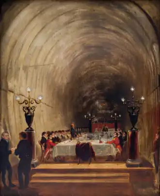 The excavation was hazardous. The tunnel flooded suddenly on 18 May 1827 after 549 ft (167 m) had been dug.[4] Isambard Kingdom Brunel lowered a diving bell from a boat to repair the hole at the bottom of the river, throwing bags filled with clay into the breach in the tunnel's roof. Following the repairs and the drainage of the tunnel, he held a banquet inside it.