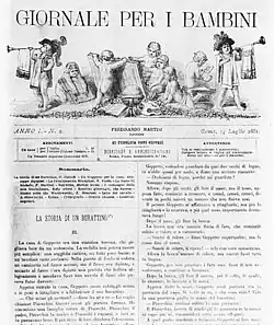 Collodi wrote a number of didactic children's stories for the recently unified Italy, including Viaggio per l'Italia di Giannettino ("Little Johnny's voyage through Italy"; 1876), a series about an unruly boy who undergoes humiliating experiences while traveling the country, and Minuzzolo (1878).[8] In 1881, he sent a short episode in the life of a wooden puppet to a friend who edited a newspaper in Rome, wondering whether the editor would be interested in publishing this "bit of foolishness" in his children's section. The editor did, and the children loved it.[9]