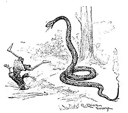 As Pinocchio heads back to the forest, he finds an enormous snake with a smoking tail blocking the way. He asks the serpent to move, but it remains completely still, and he assumes it is dead. He begins to step over it, but it suddenly rises up and hisses at him, toppling him over onto his head. Struck by Pinocchio's fright and comical position, the snake laughs so hard he bursts an artery and dies.