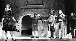 ![]() The main characters of The Adventures of Tintin from left to right: Professor Calculus, Captain Haddock, Tintin and Snowy, Thomson and Thompson, and Bianca Castafiore | |||