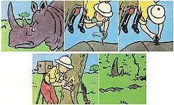 Drawing on André Maurois' Les Silences du colonel Bramble, Hergé presents Tintin as a big-game hunter, accidentally killing fifteen antelope as opposed to the one needed for the evening meal. However, concerns over the number of dead animals led Tintin's Scandinavian publishers to request changes. A page of Tintin killing a rhinoceros by drilling a hole in its back and inserting a stick of dynamite was deemed excessive; Hergé replaced the page with one in which the rhino accidentally discharges Tintin's rifle while he sleeps under a tree.[92] In 2007, the UK's Commission for Racial Equality called for the book to be pulled from shelves after a complaint, stating: "It beggars belief that in this day and age Borders would think it acceptable to sell and display Tintin in the Congo."[100] In August 2007, a Congolese student filed a complaint in Brussels that the book was an insult to the Congolese people. Public prosecutors investigated, and a criminal case was initiated, although the matter was transferred to a civil court.[101] Belgium's Centre for Equal Opportunities warned against "over-reaction and hyper political correctness".[102]