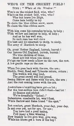 The Ashes is a Test cricket series played biennially between England and Australia. The term originated in a satirical obituary published in a British newspaper, The Sporting Times, immediately after Australia's 1882 victory at The Oval, its first Test win on English soil. The obituary stated that English cricket had died, and that "the body will be cremated and the ashes taken to Australia".[1] The mythical ashes immediately became associated with the 1882–83 series played in Australia, before which the English captain the Hon. Ivo Bligh had vowed to "regain those ashes". The English media therefore dubbed the tour the Quest to regain the Ashes.