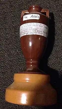 After England won two of the three Tests on the tour, a small urn was presented to Bligh at Melbourne.[2] The contents of the urn are reputed to be the ashes of a wooden cricket bail.[3] It is not clear whether that "tiny silver urn" is the same as the small terracotta urn given to Marylebone Cricket Club (MCC) by Bligh's widow after his death in 1927.