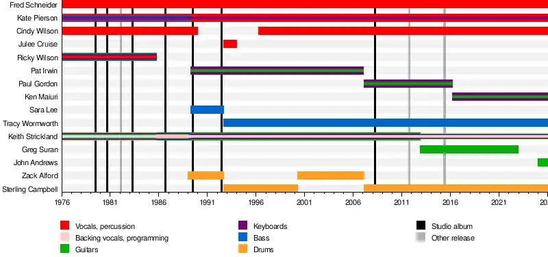 The B-52s, originally presented as the B-52's (with a plural apostrophe; used until 2008), are an American band formed in Athens, Georgia, in 1976.[8] The original lineup consisted of Fred Schneider (vocals, percussion), Kate Pierson (vocals, keyboards, synth bass), Cindy Wilson (vocals, percussion), Ricky Wilson (guitar, vocals), and Keith Strickland (drums, guitar, keyboards, vocals). Ricky Wilson died of AIDS-related illness in 1985,[9] and Strickland permanently switched from drums to lead guitar. The band has also added various members for albums and live performances.