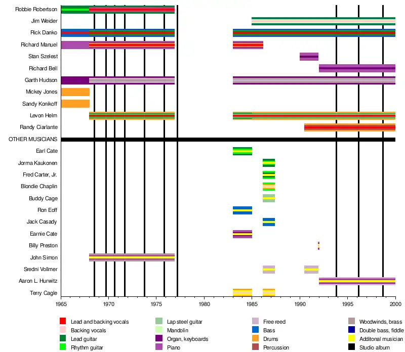 - Rick Danko – bass guitar, vocals, guitar, double bass, fiddle (1965–1977, 1983–1999; his death)