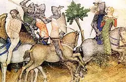 The upper class or nobility, represented chiefly by the Knight and his Squire, was in Chaucer's time steeped in a culture of chivalry and courtliness. Nobles were expected to be powerful warriors who could be ruthless on the battlefield yet mannerly in the King's Court and Christian in their actions.[51] Knights were expected to form a strong social bond with the men who fought alongside them, but an even stronger bond with a woman whom they idealised to strengthen their fighting ability.[52] Though the aim of chivalry was to noble action, its conflicting values often degenerated into violence. Church leaders frequently tried to place restrictions on jousts and tournaments, which at times ended in the death of the loser. The Knight's Tale shows how the brotherly love of two fellow knights turns into a deadly feud at the sight of a woman whom both idealise. To win her, both are willing to fight to the death. Chivalry was on the decline in Chaucer's day, and it is possible that The Knight's Tale was intended to show its flaws, although this is disputed.[53] Chaucer himself had fought in the Hundred Years' War under Edward III, who heavily emphasised chivalry during his reign.[54] Two tales, Sir Topas and The Tale of Melibee, are told by Chaucer himself, who is travelling with the pilgrims in his own story. Both tales seem to focus on the ill-effects of chivalry—the first making fun of chivalric rules and the second warning against violence.[55]