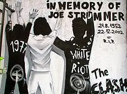 A confrontation between Black youth and police at the 1976 Notting Hill Carnival was important in the development of the Clash's political stance and inspired Joe Strummer to write "White Riot". Images of the riots were used as The Clash's stage backdrop and as the back cover of their first album, and was reprinted on badges and Clash t-shirts.[42]