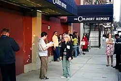 The Colbert Report was taped and broadcast four nights a week, Monday–Thursday.[19] The show's taping studio, at 513 W. 54th Street in New York City's Hell's Kitchen neighborhood, was used for The Daily Show until July 2005,[7] and has a capacity of 150.[29] NEP Studio 54 on 54th Street is owned by NEP Broadcasting which is New York City's largest production facility and also owns The Daily Show set at NEP Studio 52 two blocks south on 52nd Street. Aside from the set, the show's production offices have been described as "loft-like" and "all overhead pipes and exposed brick."[21] Following the show's conclusion, the building was used for The Nightly Show with Larry Wilmore.[30]