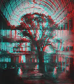 The new building was elevated several metres above the surrounding grounds, and two large transepts were added at either end of the main gallery. It was modified and enlarged so much that it extended beyond the boundary of Penge Place, which was also the boundary between Surrey and Kent. The reconstruction was recorded for posterity by Philip Henry Delamotte, and his photographs were widely disseminated in his published works. The Crystal Palace Company also commissioned Negretti and Zambra to produce stereographs of the interior and grounds of the building.[38] Within two years the rebuilt Crystal Palace was complete, and on 10 June 1854, Queen Victoria again performed an opening ceremony, in the presence of 40,000 guests.[39]